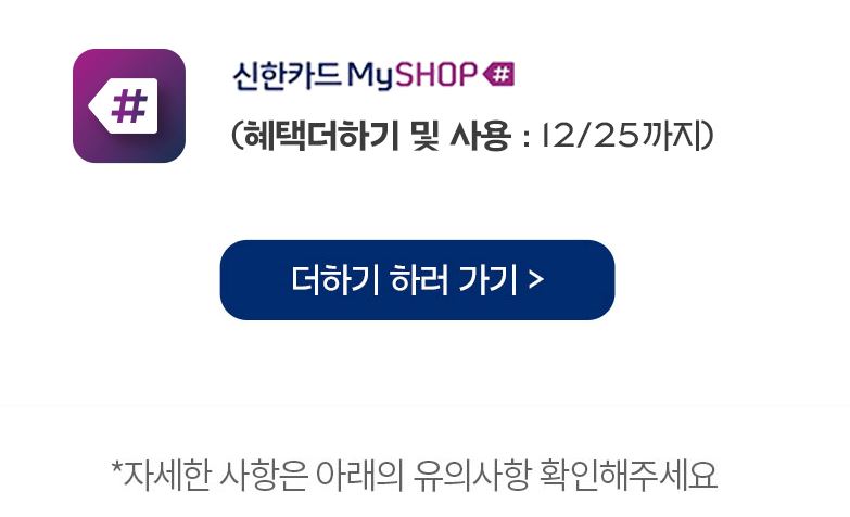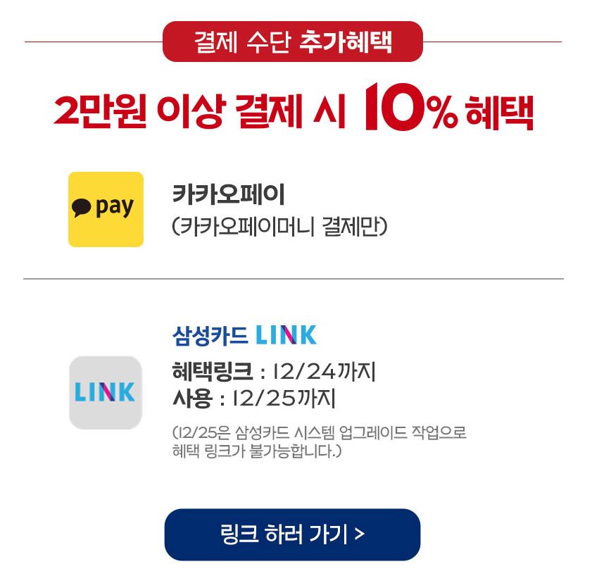 2만원 이상 결제시에 10%추가 할인 혜택을 챙길 수 있습니다. 일단 삼성카드와 신한카드, 카카오페이 세가지가 적용이 되는데요. 카카오페이머니 결제만 해당되며 삼성카드는 링크를 미리 해야하고 신한카드는 마이샵 혜택 더하기 및 사용을 해야합니다. 삼성카드는 혜택 링크를 24일까지 해야한다고 하니 방문 계획이 25일이시면 미리 링크를 해두셔야할 것 같습니다.