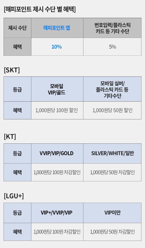 -해피포인트앱 혜택은 앱을 제시하여야 10%이며 기타수단(플라스틱 카드, 전화번호 및 카드번호입력)은 5%만 적용됩니다.