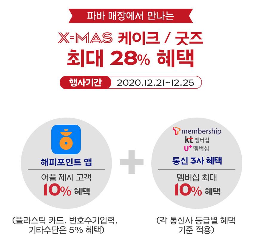 -해피포인트 앱 혜택은 일부 크리스마스 케이크 및 굿즈에 적용되며 매장에 따라 취급 여부가 상이합니다.