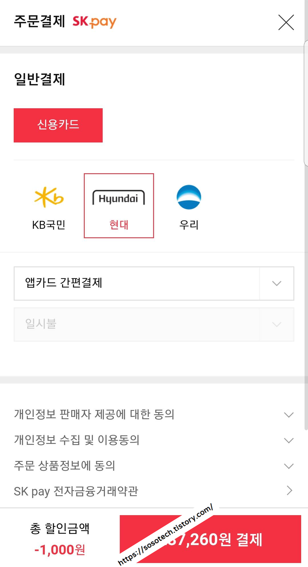 결제를 할 때는 국민카드와 현대, 우리카드로 지불 할 수 있습니다. 이 때 현대카드 M포인트는 사용이 안되는 점 확인하시고 진행하시면 되겠습니다. 따로 SKPAY 포인트도 적립되지 않습니다.