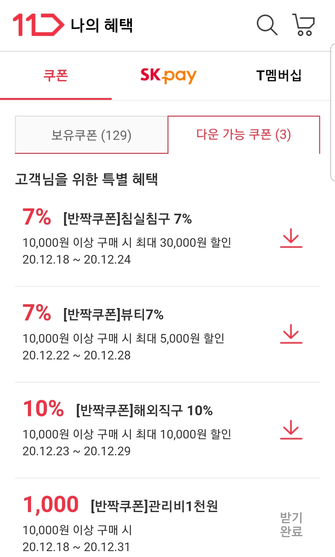 이렇게 첫달과 두달 뿐이면 아쉽겠지만 마이쿠폰에 보면 한달이나 두달에 한번정도 1천원 할인이 발행됩니다. 저도 매달 발생하지 않아서 정확한 기준을 알 수 없는데요 . 나의정보에 들어가서 쿠폰에 '다운로드 가능한쿠폰'에 들어가면 이렇게 보이기도 합니다.