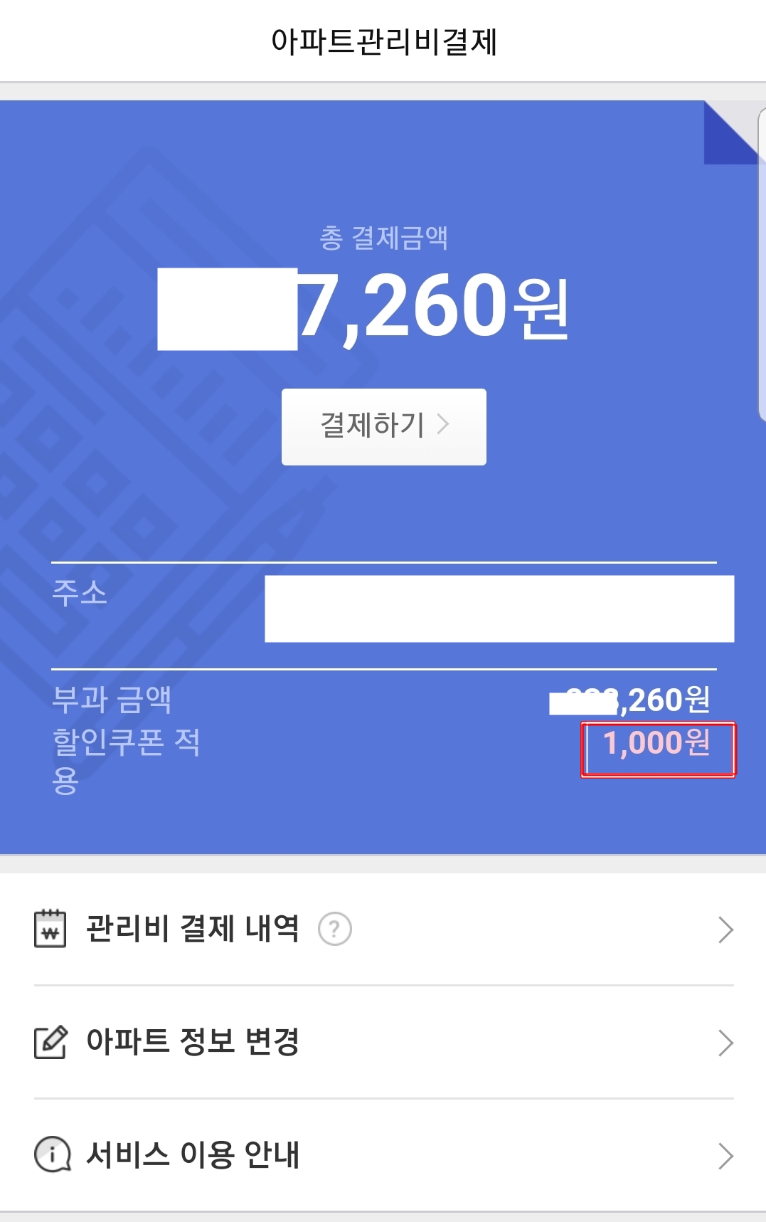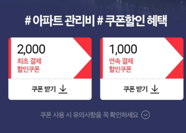 첫 결제에서는 2천원을 연속 할인 결제에서는 1천원을 주는데요 .최초 쿠폰은 해당 달 말일까지 사용가능하며 다운받고 사용을 안하게 되면 그냥 조건이 소멸됩니다. 그러면 연속 결제 까지 사용을 못하게 됩니다. 그러니까 결제를 할 수 있는 날짜에 들어가서 바로 하는게 제일 낫습니다. 저는 처음 결제 쿠폰을 날려버려서 둘다 쓰지 못했는데요.ㅠㅠ 그냥 어쩌다보니 이 방식이 편해서 매달 여기서 아파트 관리비 할인을 정해진 카드없이 받고 있습니다 .