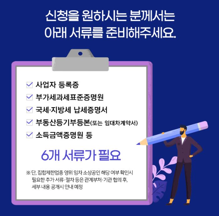 사업자 등록증, 부가세과세표준증명원, 국세,지방세 납세증명서, 부동산등기부등본(또는 임대차계약서),소득금액증명원 등 6개의 서류가 필요합니다. 단, 집합제한업종 영위 임차 소상공인 해당 여부 확인시 필요한 추가 서류 및 절차등은 관계부처와 기관 협의 후 세부 공개시 안내 예정입니다.