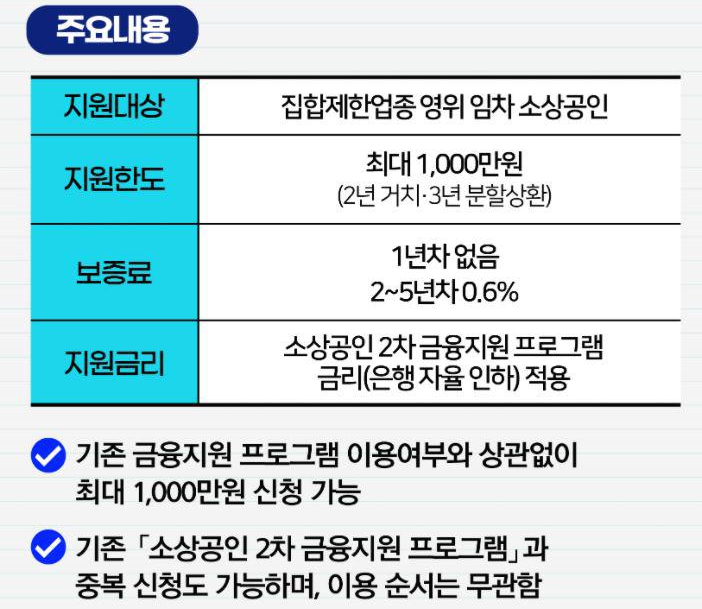 기존 금융지원 프로그램 이용여부와 상관없이 최대 1천만원, 소상공인 2차 금융지원 프로그램과 중복 신청이 가능합니다.