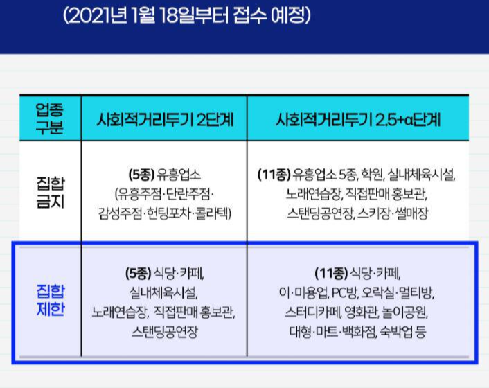 거리두기 2.5단계 이후 11종 : 식당,카페, 이,미용업, PC방, 오락실, 멀티방, 스터디카페, 영화관, 놀이공원, 대형마트 , 백화점, 숙박업 등