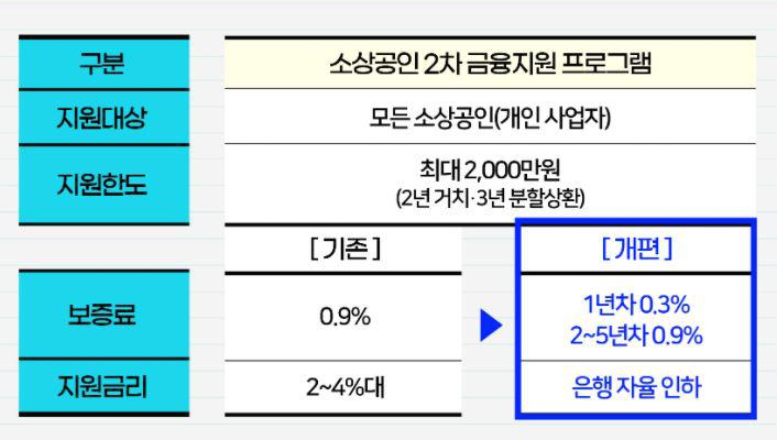 소상공인 2차 금융지원 프로그램은 모든 소상공인(개인사업자)에 해당하며 최대 2천만원 (2년거치, 3년 분할상환)조건을 가지고 있습니다. 기존에는 보증료가 0.9%에 지원금리가 2~4%대 유지하고 있었습니다만 새롭게 개편하여 1년차는 0.3%로 2~5년차는 0.9%로 보증료가 인하되며 지원금리는 은행자율 인하로 변경됩니다.