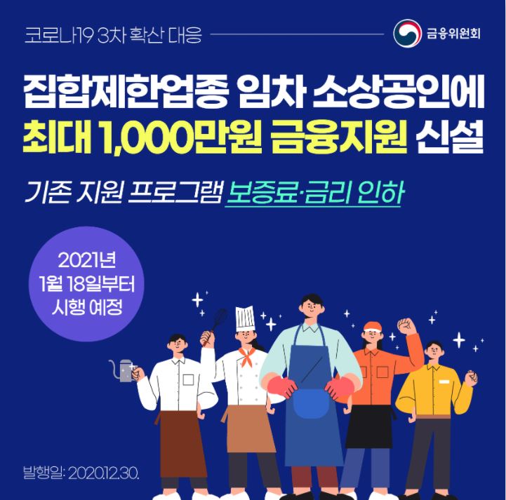 2020년의 마무리는 꽁꽁 얼어붙은 얼음 같은 추위와 한산한 거리의 풍경으로 하게 되었던 것 같습니다. 자영업자들은 어느때보다 힘든 시기를 보내고 있을거라 생각이 되는데요. 코로나 3차 확산 대응으로 인해 2,5단계로 집합제한업종 이었던 임차 소상공인에 대한 금융지원 신설에 대한 소식이 들려옵니다. 그리고 2차 소상공인 지원에 대한 확대 개편 소식도 있습니다.