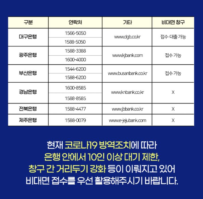 비대면 창구 접수 및 대출 가능 (5개은행 ) : 기업,국민, 우리, 신한,대구