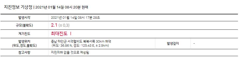 얼마전 서해안 해역에서 발생한 2.1감도 지진이 2021년 1월 14일 08시 17분 28초에 발생했습니다.