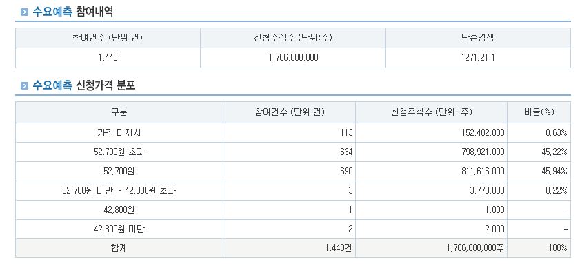 기업의 수요예측은 지금 중요한 지표가 되었습니다. 워낙에 지금 IPO가 관심이 많다보니 어제인가 기사에서도 볼 수 있었는데요. 수요예측의 경쟁률이 낮은 기업은 상장일에 주가 하락이 대부분의 추세다라는 내용이었습니다. 일단 1000은 넘고 봐야하는데요.