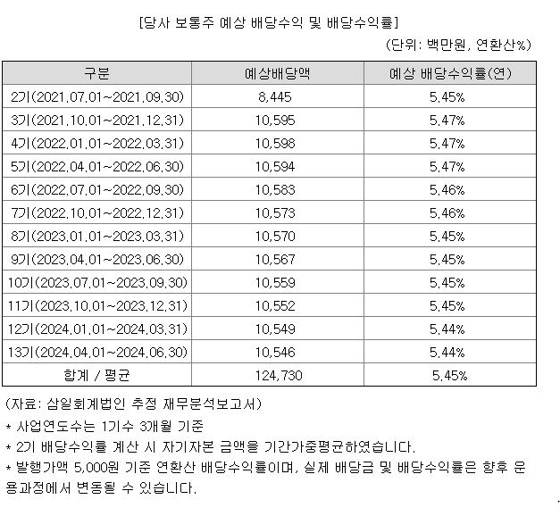 투자설명서에 나와있는 분기배당 수익률 추정치입니다. 9월에 상장하게 되니 상장이후 소유하시는 분들은 10월 1일 기준으로 배당을 받게 될 텐데요. 2021년 10월 1일부터 12월 31일까지 3기 예상 배당수익률은 5.47%정도 예상됩니다.