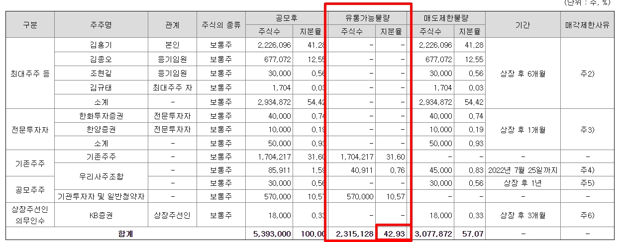 그 외 최대주주들은 상장후 6개월, 전문투자자는 1개월, kb증권은 상장후 3개월동안 매도가 제한됩니다.