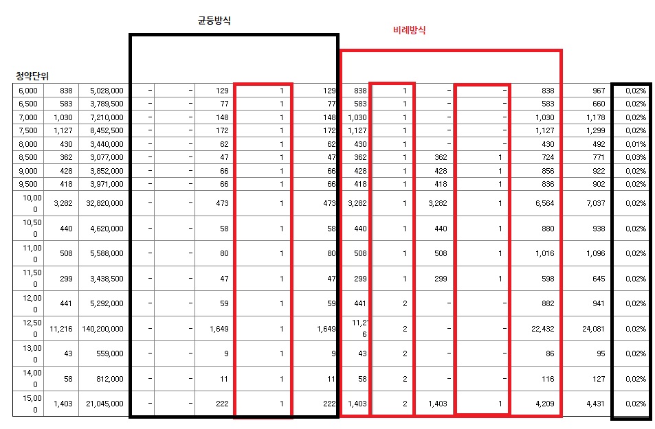 청약배정상황 중 6,000주 이상 청약부터 가져온 자료인데요. 균등으로 1주씩 받고 추가로 1주에서 2주를 받으면 총 2주에서 3주 된다는 얘기입니다. 15,000주를 전부 풀로 청약하신분도 최대치는 4주가 될 것 같은데요.