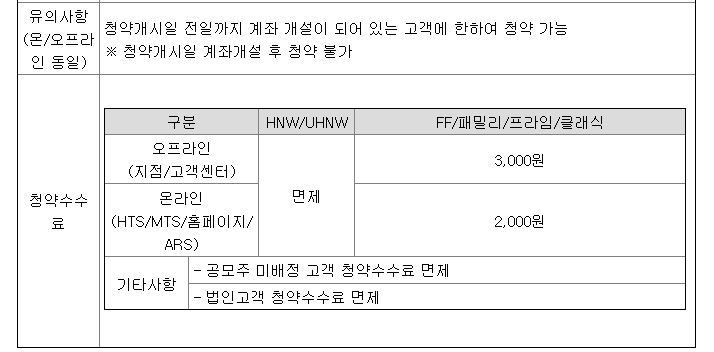삼성증권은 오프라인 청약을 이용하기 위해서는 과거 3개월간 자산평가 합계 평잔 2천만 원 이상이어야 합니다. 그 외 고객이라면 온라인 청약만 가능합니다. 온라인으로는 일정 시작 전날인 9월 6일까지 계좌 개설이 완료되어 있어야 하며 수수료는 2천 원입니다. ARS도 온라인 청약에 포함되며 오프라인 청약은 영업점 방문과 유선, 고객센터 상담원 연결입니다.