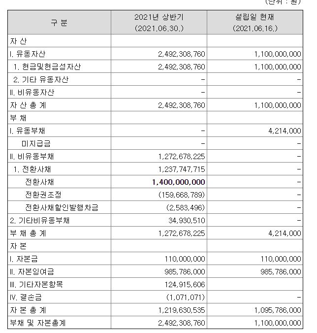2021년 6월 16일에 설립되어 상반기 재무현황을 확인해 볼 수 있었습니다. 설립금으로 11억 원을 모았고 전환사채를 발행하여 14억 원을 모았습니다. 기존 주주의 발행 주식의 가격은 주당 1천 원입니다.