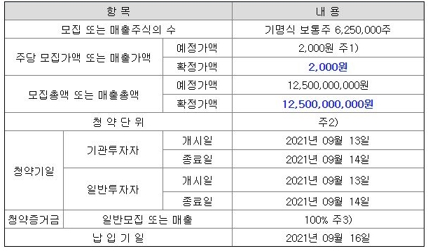 기관투자자와 일반투자자의 청약일은 9월 13일과 14일로 일정이 같습니다. 다만 기업 종목의 공모주 청약과 다른 점은 증거금이 100% 필요하다는 점입니다. 균등과 비례 배분으로 나뉘는 것은 동일하지만 증거금은 100%를 준비해야 하기에 균등 10주를 준비한다면 20,000원을 준비하셔야 합니다.