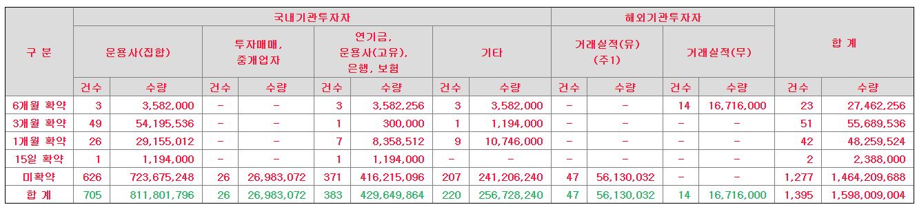 당일 유통물량은 공모주 외에도 기존 주주가 11.38%가 있습니다. 공모 물량까지 합쳐 당일에 나올 수 있는 비율은 전체의 27.41%입니다. 전체로 놓고 보면 당일 유통물량이 엄청 높은 것 같지는 않은데, 의무보유확약이 많이 적기는 합니다.