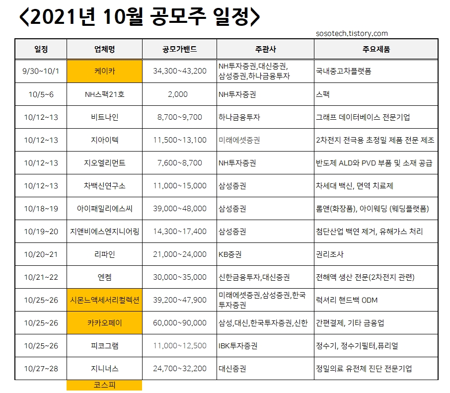 2021년 10월 공모주 청약 일정, 유망 공모주를 정리해봤습니다. 벌써 9월이 내일이면 마지막이네요. 10월에는 어떤 기업들이 있는지 가끔 들여다 보고는 했었는데, 가장 큰 기대주였던 카카오페이가 역풍을 맞으면서 상장일 또한 뒤로 밀리게 되었어요. 사실 비싸단 감이 있었기에 공모가 밴드가 또 하향되지는 않을까 살짝 기대를 해보았는데, 그건 없다고 하네요. 자세한 건 아래에서 얘기하도록 하겠습니다.