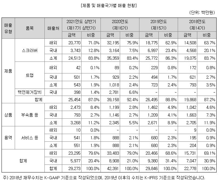 스크러버의 주요 매출은 해외 비중이 높으며 그 외 다른 분야의 비중은 적은 편입니다. 해외 기업에서의 이슈가 발생하여 수출이 어려워지면 기업의 운영에 어려움이 있을 수 있다는 위험 요소가 있습니다.
