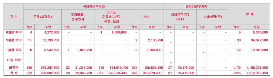 지앤비에스엔지니어링 공모주 수요예측 결과에서의 의무보유확약률은 매우 낮습니다. 미확약이 약 95%에 달하며 확약은 4.38%입니다. 따라서 상장 당일 나올 수 있는 기관의 공모주 물량은 매우 많습니다.