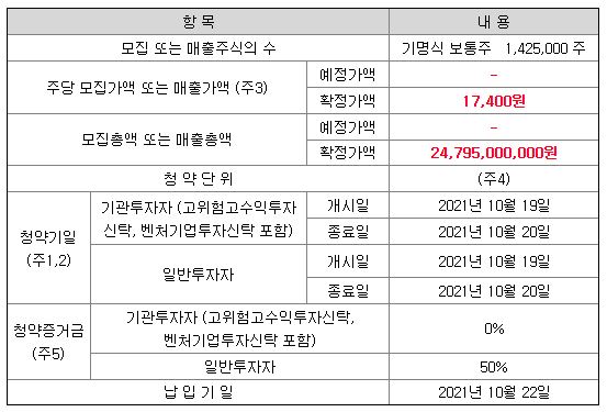 일반 공모 청약일정: 2021년 10월 19일~20일