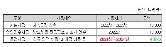 다음은 공모로 모인 자금의 사용목적입니다. 시설자금은 제3 공장을 신축, 영업양수자금은 반도체용 진공펌프 제조사 인수입니다. 공장을 신축하면 생산량을 늘릴 수 있고 진공펌프 제조사를 인수하면 파이프라인이 확장될 수 있습니다.