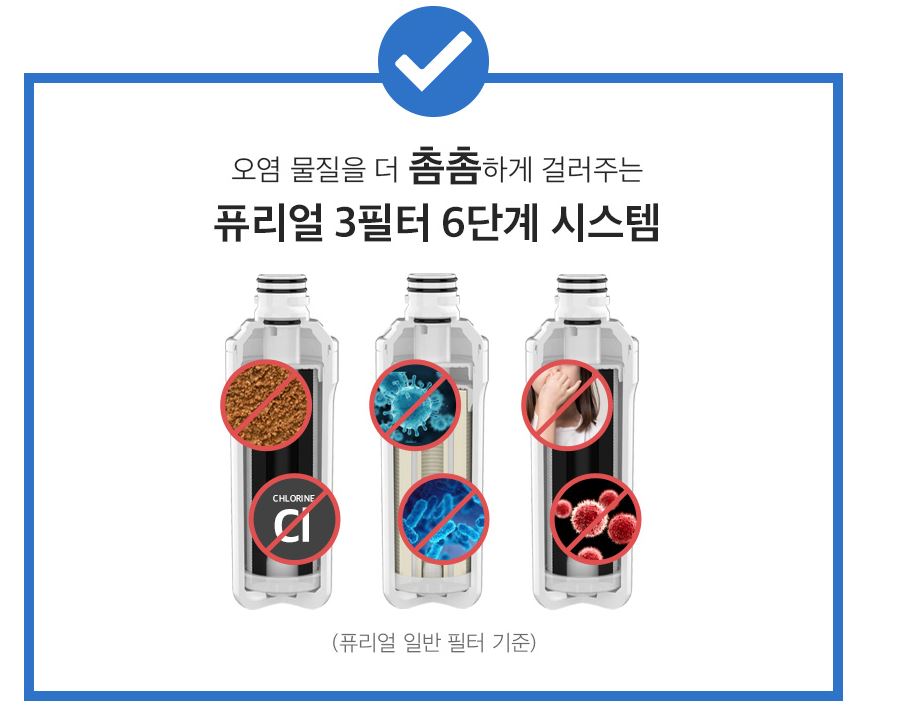 퓨리얼의 카본 필터 기술이 핵심이라고 하는데요. 필터가 세개나 있어 6단계 시스템으로 걸러집니다. 우리나라나 동남아아시아 등 정수 필터가 꼭 필요한 나라에 진출하기에 알맞은 제품인 것 같습니다.