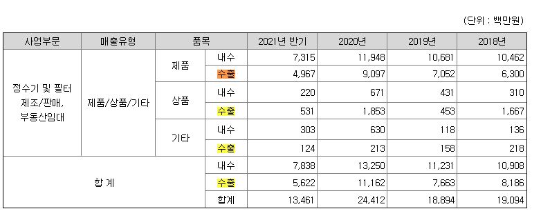 매출라인을 살펴보면 제품 매출은 정수기와 필터, 악세사리로 나누어지고 상품은 필터와 기타 정수기 악세사리로 나누어집니다. 매출 부분에서는 제품의 매출이 가장 큽니다. 또 완제품을 oem/ odm 공급을 하고 있는데 교원, 현대렌탈케어, 대림비앤코 등이 있닫다고 합니다.