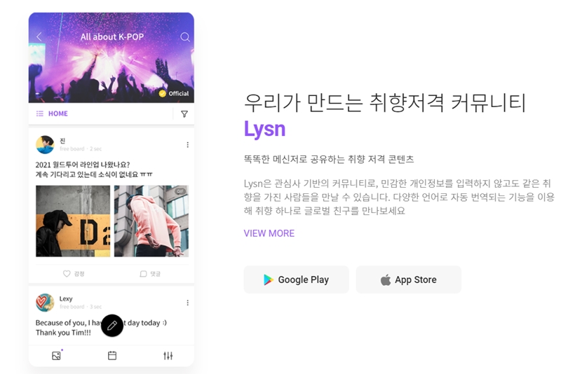 이건 위비톡을 만든 업체 (주)브라이니클을 인수한 후에 처음으로 론칭했던 어플인데요. LYSN은 아티스트 전용 팬 커뮤니티 플랫폼이라고 합니다.