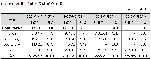 2020년 이후 가장 많은 매출액을 차지하고 있는 버블입니다. 실제 아티스트와 메시지를 주고받을 수 있는 수단이라고 합니다. 이런 어플에 대해서 언뜻 얘기를 들어봤던 것 같은데, 팬들은 직접 아티스트와 소통할 수 있어서 굉장히 좋아한다고 들었습니다.