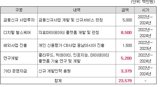 신규 공모자금으로는 금융신규 사업투자, 의료 관련 플랫폼 개발과 런칭, 해외 사업진출, 인공지능, 마이데이터 플랫폼 기술을 연구 개발하겠다고 합니다.