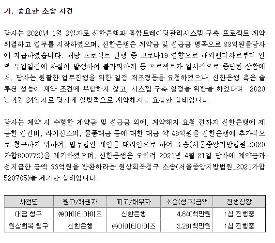 현재 소송사건이 있습니다. 우발 부채라고 하여 특이사항이 생길 수 있어 투자설명서에 고시하고 있는데요. 신한은행과의 프로젝트 협약을 하였다가 일방적으로 계약 해지를 당해서 소송을 진행했는데, 원상회복 청구로 다시 신한은행에서 맞고소를 한 상황입니다.
