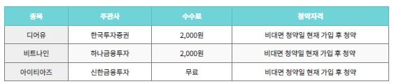 | 종목 | 주관사 | 수수료 | 청약자격 |