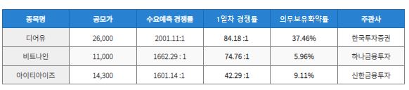 <비트나인, 디어유, 아이티아이즈 공모주 청약 경쟁률 비교>