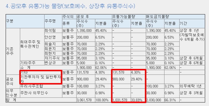 피코그램 상장일 유통가능물량입니다.공모주를 제외하고는 4.30%로 공모주주의 비율이 가장 높습니다. 거기에 일반 공모 수량은 250,000주로 25%의 비율입니다. 기관투자자의 IPO물량은 의무보유확약을 제외하고 약 79%를 당일 매도 가능합니다.