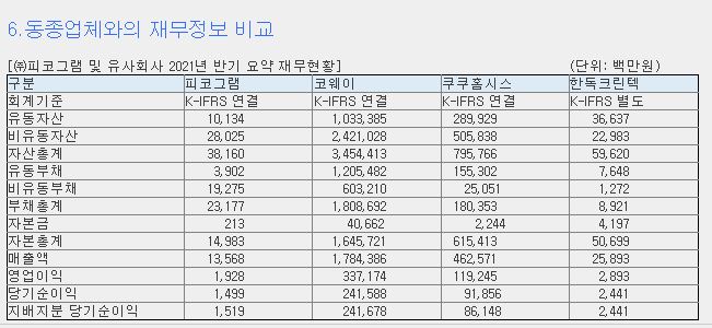 피코그램 상장일 가격이 합당한가는 아무도 알 수 없습니다. 시장이 얼마나 받아주느냐의 문제인데요. 기존 정수기 사업 관련한 피어그룹과 비교해보았습니다. 재무나 이익이 약 2배정도로 보이는 한독크린텍과 비교해보자면 현재 주가가 13,000원입니다.