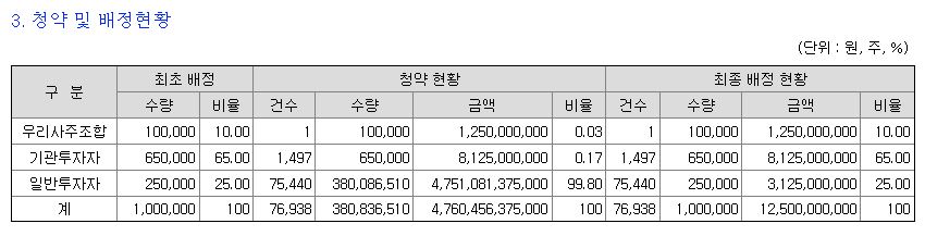 | 기업명 | 수요예측 경쟁률 | 일반 경쟁률 | 균등배정수 | 의무보유확약률 |