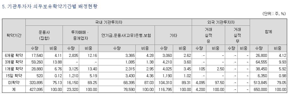 마지막으로 의무보유확약률입니다. 미확약이 79.05%로 확약이 20.95%입니다. 최초 수요예측에서 의무보유확약이 12. 96%였던 것에서 약 7.99%증가했습니다. 반면 당일에 상장하는 카카오페이는 70%에서 오히려 감소를 했었는데요. 의무보유확약률이 증가한 것은 피코그램 상장일 주가에 긍정적인 면입니다.