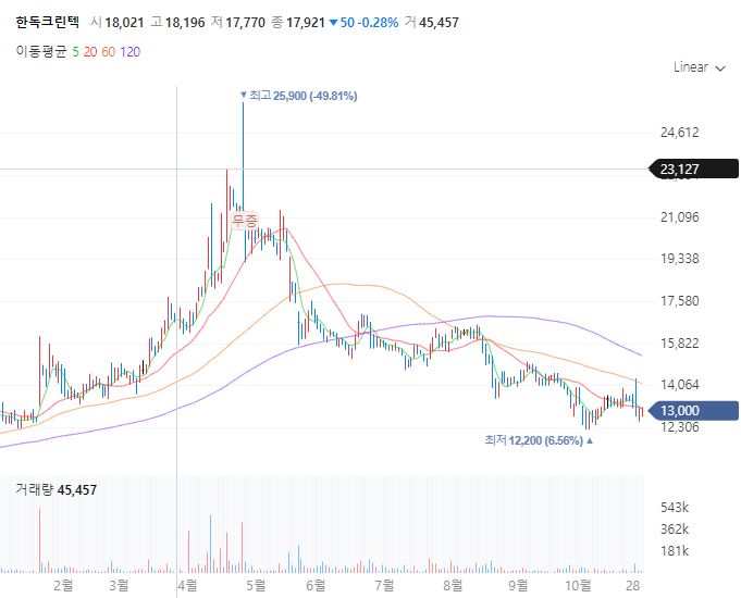 무상증자를 통해 주식 수를 늘린 후 주가는 계속해서 하락하고 있는 추세인데요. 한독 크린텍과 비교해 봤을 때는 이 매출과 재무라면 지금의 상장가인 12,500원에서 조금 더 위쪽으로 주가가 형성되지 않을까 생각해봅니다.
