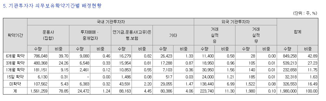 기존의 37.46% 보다 무려 46.05%나 증가했습니다. 이렇게 되면 당일 기관 배정 수량에서 당일 유통물량은 326,553주입니다. 기관의 배정수량에서 상당 부분은 당일에 유통되지 않는다는 점에서 디어유 상장일에 따상 갈 확률이 매우 높다 할 수 있겠습니다.