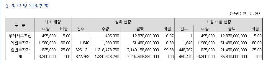 | 수요예측 경쟁률 | 청약 일반 경쟁률 | 균등배정수 | 의무보유확약률 |