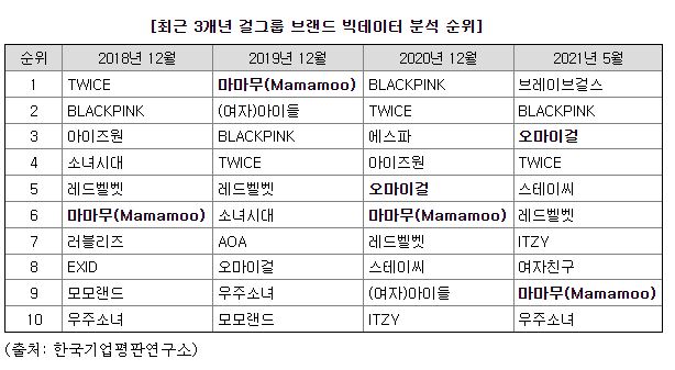 마마무는 2019년에는 걸그룹 브랜드 빅데이터 분석 순위에서 1위를 차지했습니다. 최근에는 그룹활동보다는 개별활동을 많이 하고 있는 것으로 알고 있는데도 여전히 10위 안에 들어있습니다. 거기에 지분 인수를 통해 확보한 아티스트인 오마이걸의 순위 또한 2020년부터 높습니다.