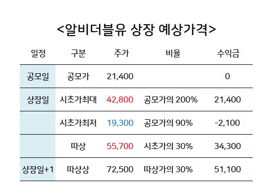 알비더블유 상장일 따상 예상가격입니다. 공모가가 낮은편이라 주식수가 많지 않다면 수익금은 크지 않을 것으로 예상됩니다. 공모주 경쟁률이 굉장히 치열했기 때문에 일반 공모주주들도 크게 이득을 보기 힘든 상황인 것 같습니다.