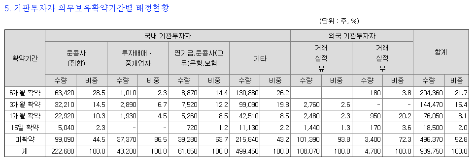 기관투자자의 의무보유확약률입니다. 총 47.2%로 최종 배정되었습니다. 수요예측 결과에서는 15.98%였던 것에 비하면 상당히 높은 수준입니다.