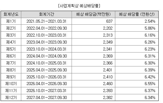 이는 2021년 10월 8일, 1차 유상증자를 통해 모집한 사모자금 약 702억원 및 중순위대출 차입금 약 520억원을 재원으로 취득했다고 합니다.