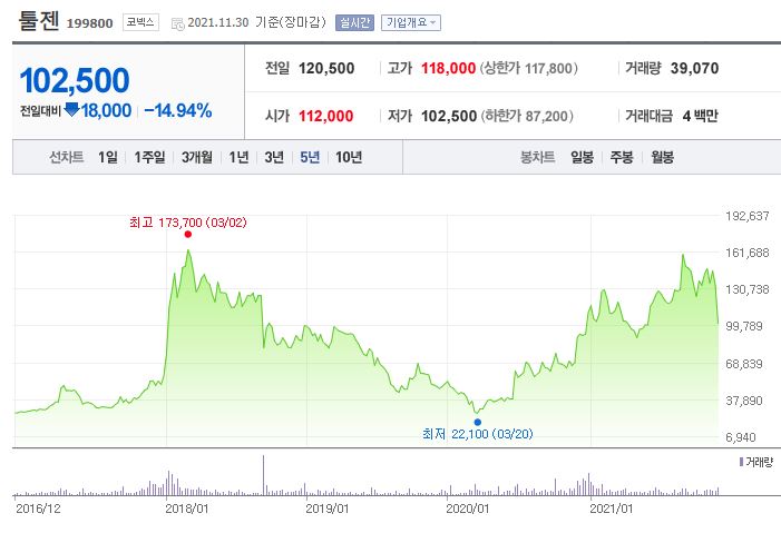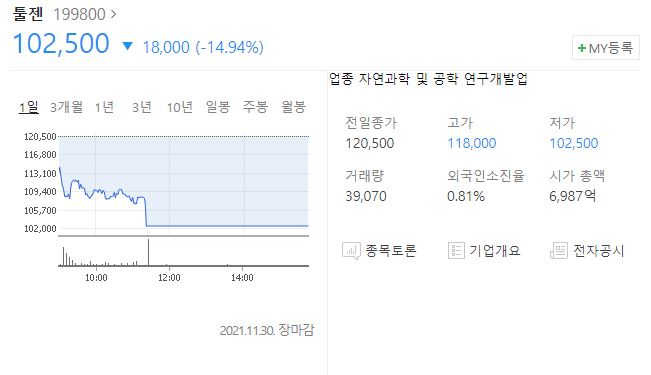11월 30일 툴젠 공모주 수요예측 결과가 나온 뒤 코넥스 주가는 급락했습니다. 이전 종가만 해도 12만원대를 유지하던 시세는 현재 10만원대로 하락했는데요. 공모가가 7만원에 확정된 만큼 당분간 코넥스 시세 흐름 또한 좋지 못할 것으로 예상됩니다.