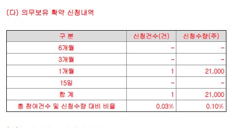 의무보유확약입니다. 이정도면 툴젠 수요예측 결과는 참패가 아닌가 싶을 정도입니다. 1개월에 확약 단 한건만 신청이 존재합니다.
