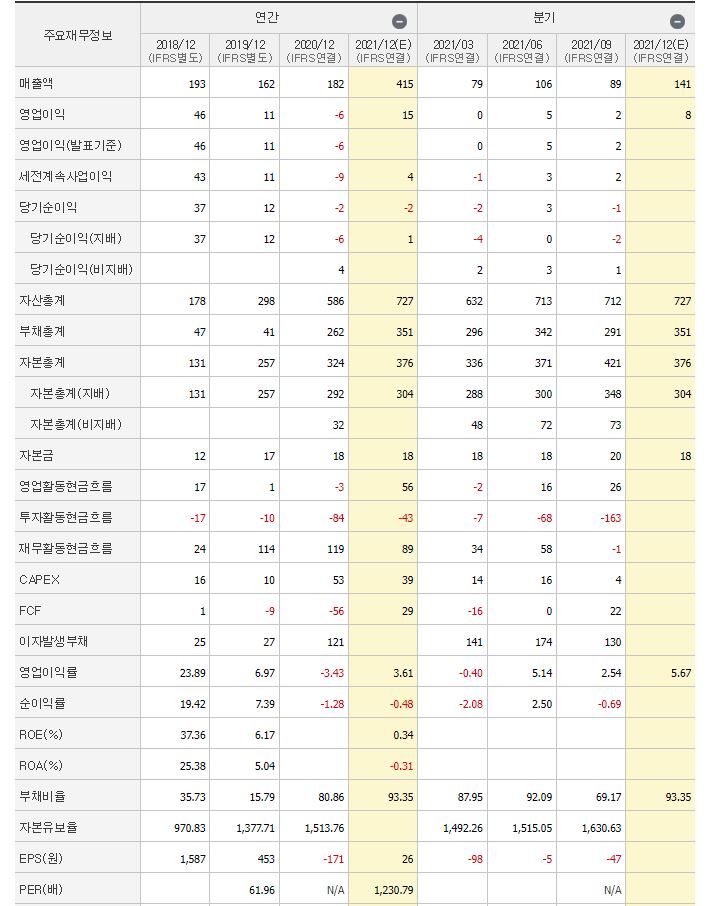 재무재표입니다.2021년 영업이익의 총계는 이전년도보다 증가할 것으로 보입니다.