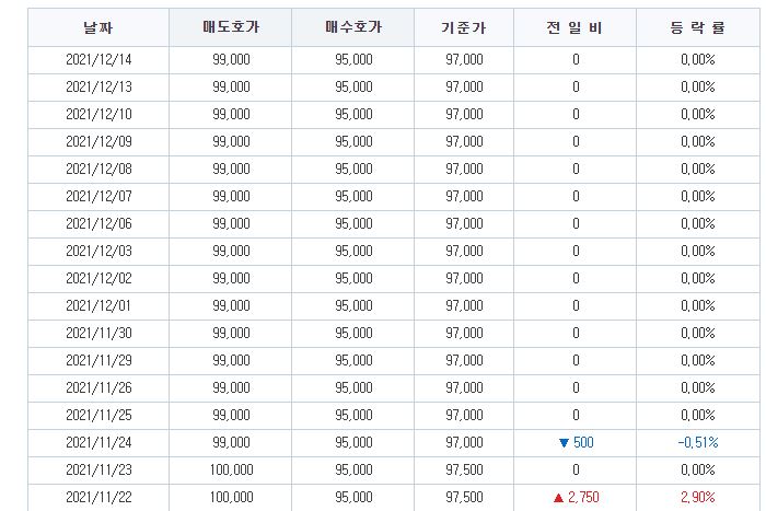 장외 시세를 살펴봤습니다. 최고 11만 6천원까지 기록했다가 지금은 97000원대에 거래되고 있습니다. 이는 실시간 자료가 아니기 때문에 대략적인 흐름만 살펴보시면 되겠습니다만 최고치로 올랐던 11만원대에 비해서는 약간 내려온 구만원 후반대에 거래가 많이 이루어지고 있는 듯 합니다.