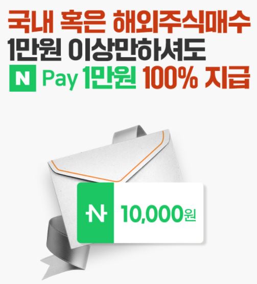 비대면 신규계좌개설을 한 고객으로 한가지 더 이벤트가 있습니다. 1만원 이상 해외 혹은 국내 주식을 매수시에 추가로 만원을 지급합니다. 역시 수단은 네이버페이와 오케이 캐시백이며 기간은 12월 31일까지로 동일합니다. 지급은 한달 뒤 15일경에 따로 문자로 지급됩니다.